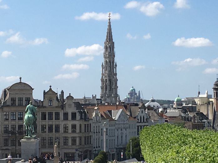 Myndin er tekin á safnahæðinni í Brussel og turnin fremst á myndinni er á fræga torginu, Grand Place.